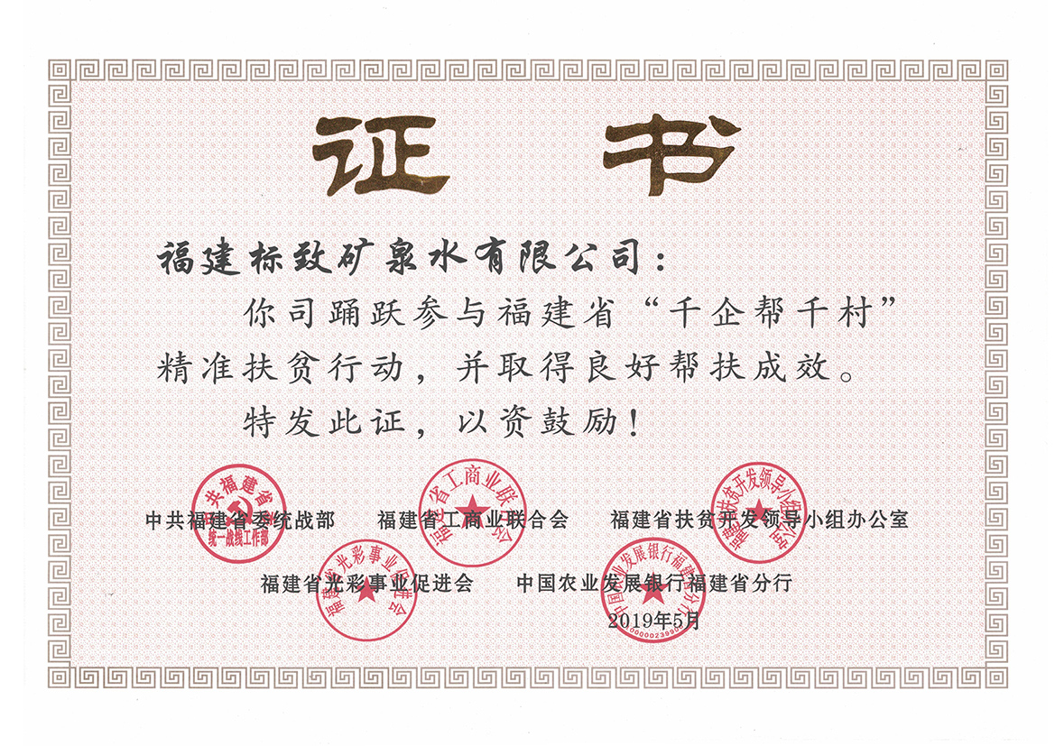 • 2020-05-132019年5月,標致公司榮獲“踴躍參與福建省‘千企幫千村’精準扶貧行動,并取得良好幫扶成效”的榮譽證書。